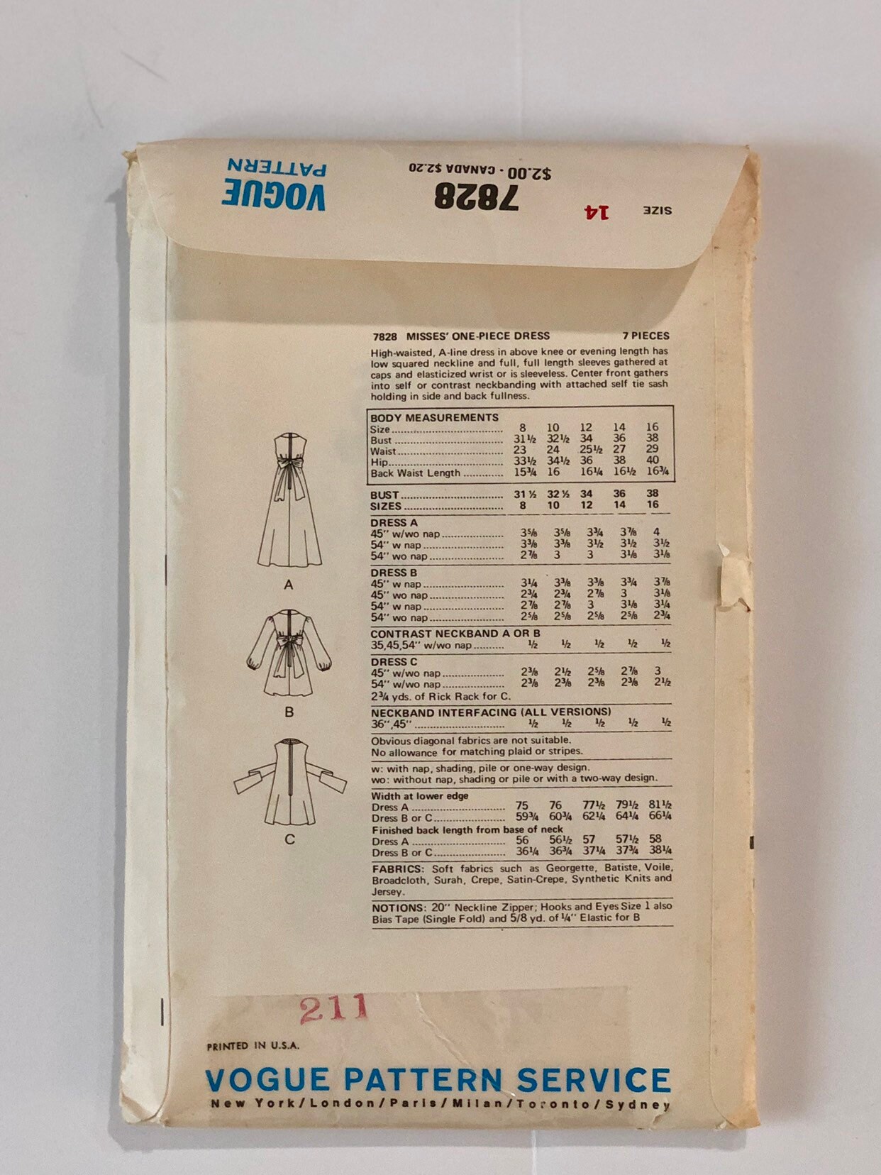 Vintage Miss Vogue Patterns 7828 B Vogue International Sewing Pattern 1970 Size 14 Bust 36 Hips 38 Pattern 3 Styles Of Dresses Rare